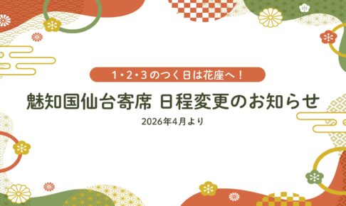 いつも魅知国定席 花座をご利用いただき、誠にありがとうございます。 このたび2026年4月1日より、花座で開催しております定期公演 「魅知国仙台寄席」 の開催日程を変更することとなりました。 これまで 上席:1日~5日 …