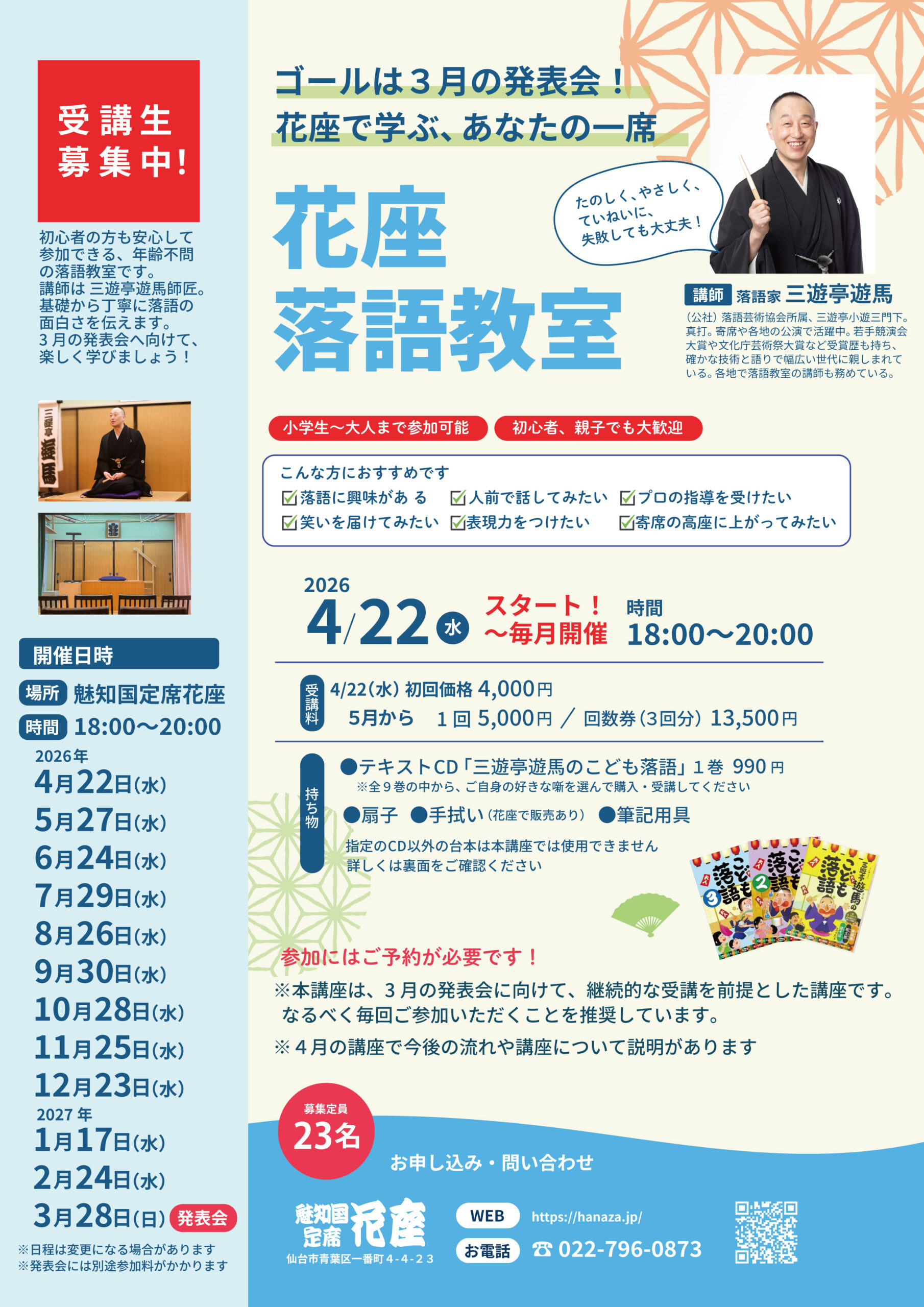 魅知国定席 花座では、2026年4月より「花座落語教室」を開講いたします。