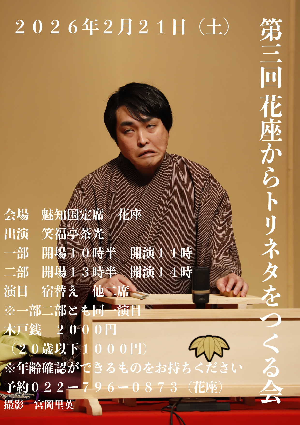 - ネット予約されたチケットは、公演当日「花座1Fカウンター」でのお渡しとなります。